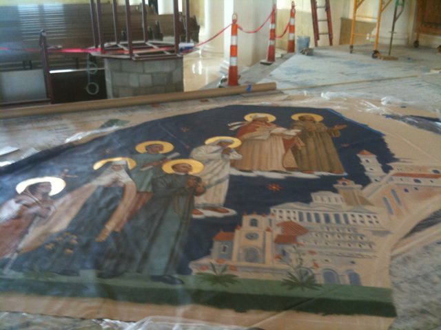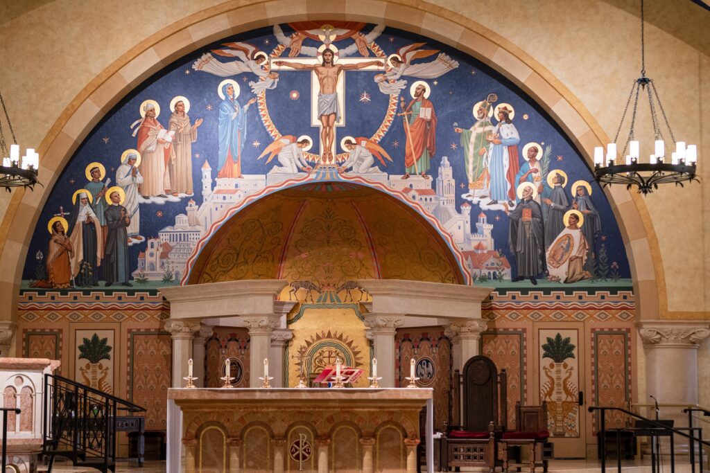 The mural behind the altar is one of the most stunning aspects of the church. It is hand-painted on canvass. It depicts Christ crucified in glory with the Father and the Holy Spirit represented above him. Angels collect his blood. And the water and blood from his sacred body, symbolizing the sacramental life of the church, flow down to the tabernacle and out into the congregation. Below Christ is an idealized heavenly city with local landmarks added. Beneath the city is a classical depiction of a heavenly garden. Behind the tabernacle is a sunburst, symbolizing Christ as the Light of the World. On the mural panels flanking the tabernacle are ancient symbols of the Eucharist, the loaves and fishes and the Pelican feeding its young. On either side of Jesus in a semicircle are saints. The first ones are Mary (on the south side) and St. Paul the Apostle (on the north). The rest of the saints were chosen as representatives of some of the ethnic groups of the parish or because they were Americans. On the south side in descending order (after Mary) are St. Francis of Assisi, the “Apostle to the Germans” St. Boniface, St. Mother Theresa, the Filipino martyr St. Lawrence Ruiz, the American St. John Neumann, the American St. Katherine Drexel, and the Native American St. Kateri Tekakwitha. On the north side in descending order (after St. Paul) are St. Patrick, the Polish Prince St. Casimir, the Ugandan African martyr St. Charles Lwanga, the Jesuit North American martyr St. Isaac Jogues, the American St. Elizabeth Ann Seton, the American St. Frances Cabrini, and the Mexican St. Juan Diego with the image of our Lady of Guadalupe (the Patroness of the Americas).
