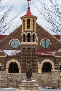 The growth of this mission community pressed Bishop Hartley in 1931 to formally establish a parish inviting the Capuchin Friars to guide and shepherd its ministry. With funds collected from parishioners and the Diocese, a small tract of land with a large red-brick residence was purchased just north of the residential district of Westerville. The Friars converted the 13-room brick residence into a monastery and hastily made plans for the parish’s first church. Welcoming parishioners to its first Mass in September 1931, this modest wooden frame church seated 150 and served many ministerial needs for the next several decades.