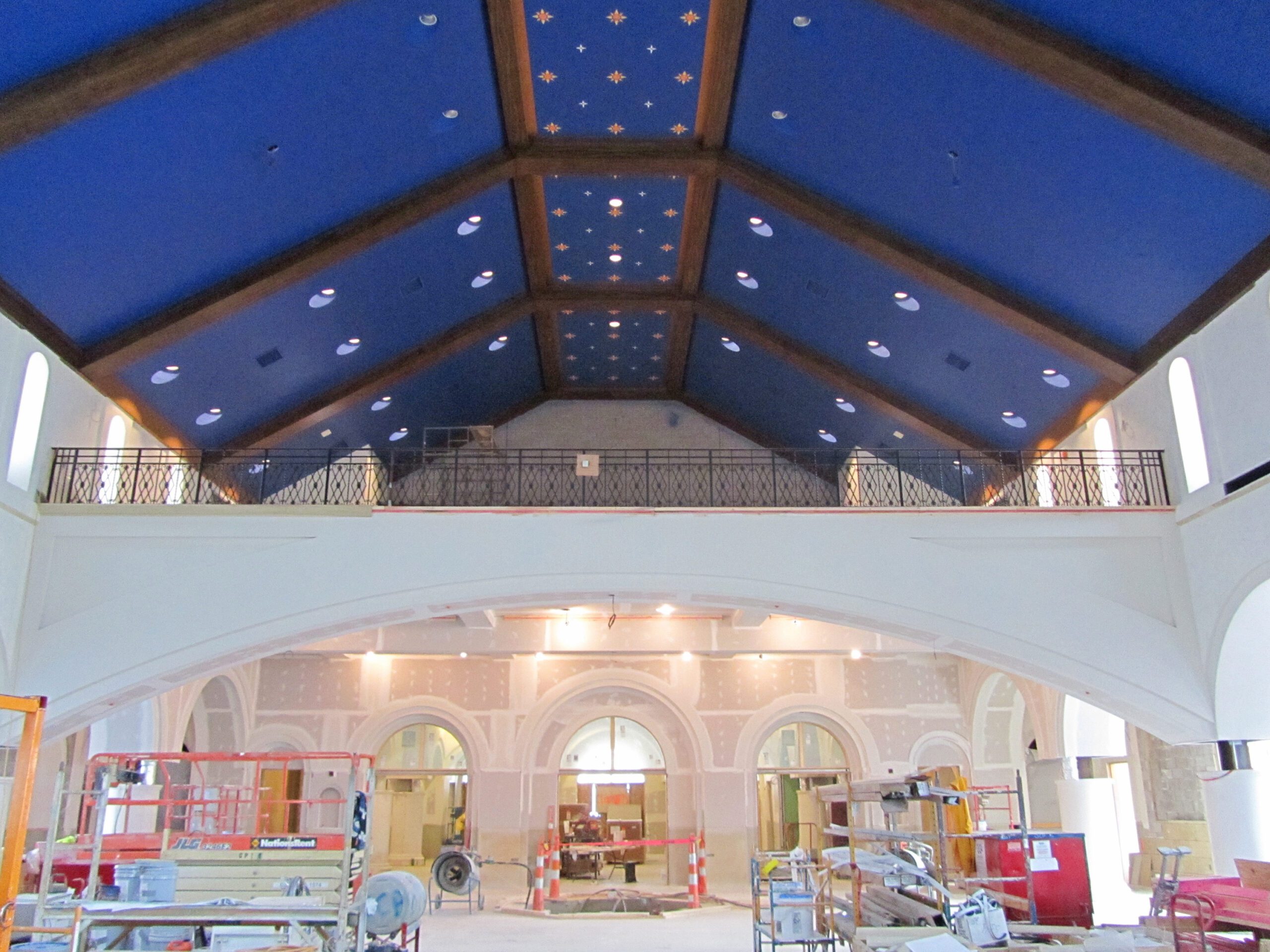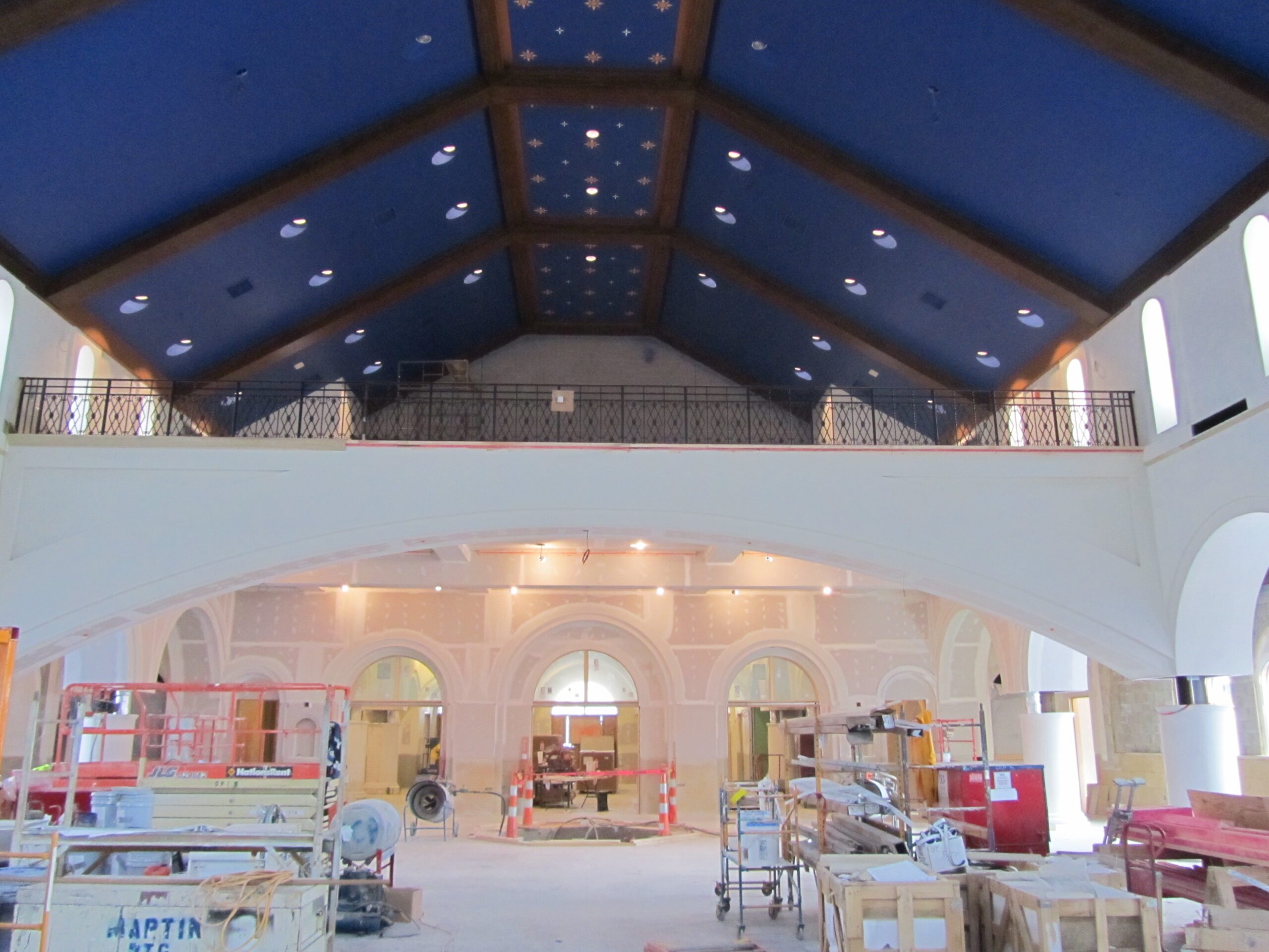 The pews are solid red oak and allow seating for 1400. The four massive columns framing the sanctuary are faux American limestone. The remaining interior columns are faux marble. The capitals of the columns have the unique design of the book and the sword, the attributes of St. Paul. There are two chapels in the church at the juncture of the nave and the transept; on the north side is the Holy Family Chapel and on the south side is the St. Paul Chapel. The ceiling is painted a dark blue with stars, symbolizing the heavens. In the cupola is an impressive large star surrounded by smaller ones. There are 164 windows in the church, all stained glass from the churches closed in the Cleveland Diocese.