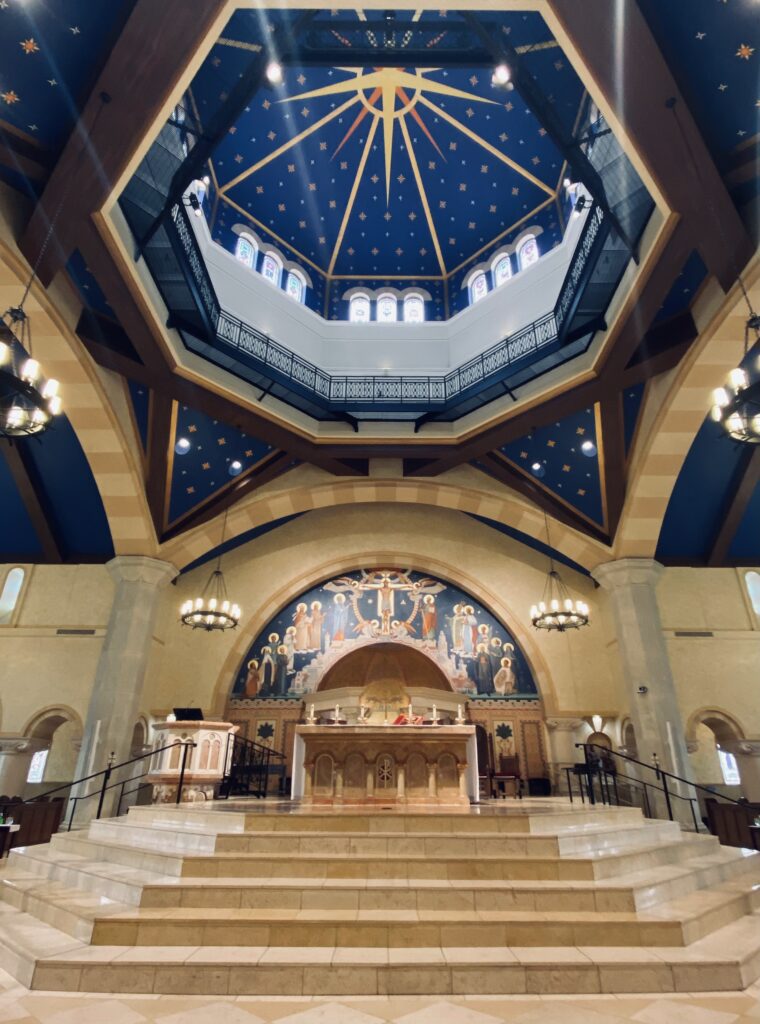 The total square footage of the building is 37,556 and the total square footage of the worship space is 22,565. The floor of the church and the wainscoting is, again, that “Jerusalem stone” which is quarried in Israel. This material is one of the hardest surfaces in the world, unlike American limestone which is quite porous. The altar of sacrifice, the altar of reservation, the pulpit, and the baptismal font are all of Jerusalem stone as well. The altars are decorated with gold and glass mosaics and feature arches and traditional symbols in the center – on the altar of sacrifice is the symbol XP (the Greek abbreviation of “Christ”) and on the altar of reservation of the Eucharist is the symbol IHS (the Greek abbreviation of “Jesus”) as well as the alpha and omega (the first and last letters of the Greek alphabet symbolizing Christ as the Beginning and the End). The beautiful fish design in the baptismal pool is of stone mosaic.