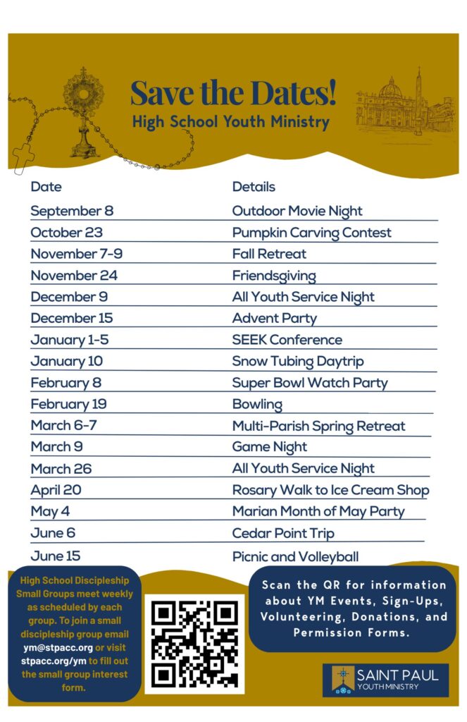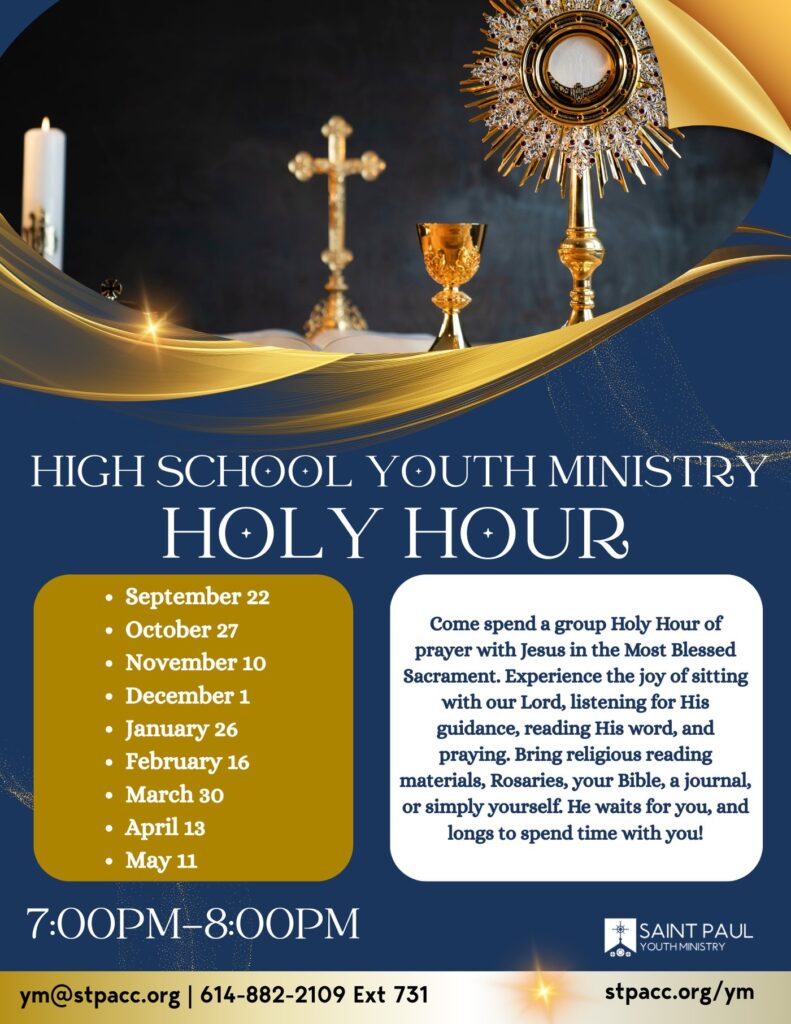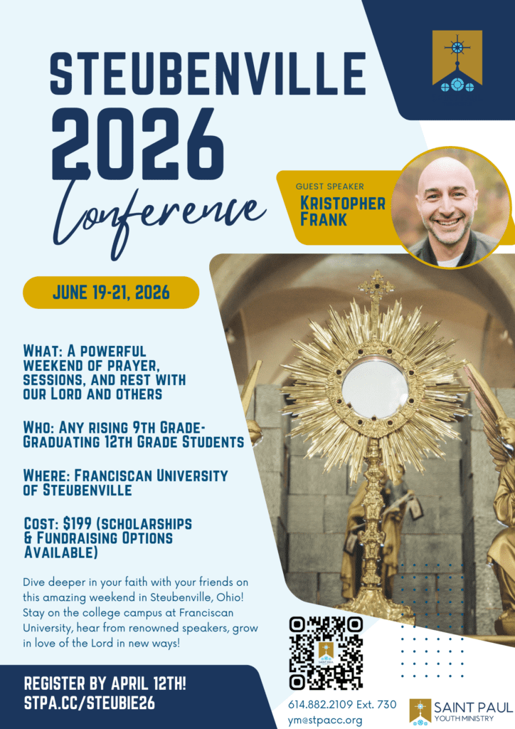 Youth Ministry at St. Paul is seen as any activities where youth are involved.  Every adult is called to minister and form our youth — the future of our Church. We are always looking for volunteers for our youth ministry program!  Contact the parish office at (614) 882-2109 or nforsthoefel@stpacc.org to find out how you can get involved!