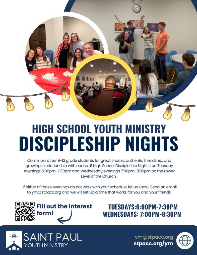 Currently, High School Discipleship Nights run Tuesday evenings 6:00pm-7:30pm on the Lower Level of the Church. Come for great snacks, authentic relationships and growing in relationship with our Lord! If Tuesday evenings do not work with your schedule, let us know! Send an email to ym@stpacc.org and we will set up a time that works for you and your friends. We can even set an event up before school if that works best!